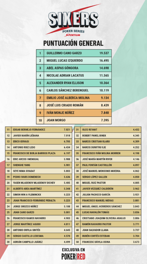 En este 2026 seguiremos dandor 1.000 puntos en La Clasificación general a todos los que jueguen el High Roller o el Main Event en una de las paradas de SIXERS. Da igual si se juega solo el High Roller, solo el Main Event o ambos. Se obtendrá un total de 1.000 puntos en todos los casos.