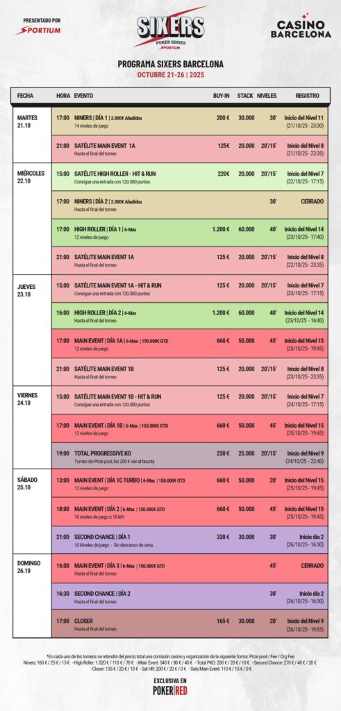 El premio: cada jugador de la pareja ganadora recibirá una entrada de 330 € para el Second Chance del sábado por la noche en Casino Barcelona. Inscribirse es gratis, exclusivo para jugadores de SIXERS, enviando un correo a [email protected].