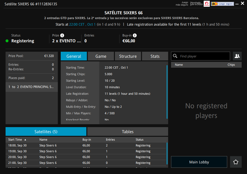 - El Main Event (660 €, 6-Max, 150.000 € GTD), con tres vuelos iniciales (jueves, viernes y sábado) y que pondrá a prueba a todos los aspirantes a La Final.